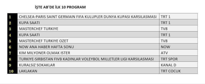 AB kategorisinde 1. sırada “Chelsea–Paris Saint Germain FIFA Kulüpler Dünya Kupası Karşılaşması”, 2. sırada “Kupa Saati”, 3. sırada ise “Masterchef Türkiye” dizisi yer aldı.