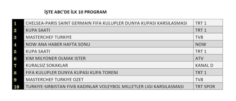 ABC kategorisinde 1. sırada “Chelsea–Paris Saint Germain FIFA Kulüpler Dünya Kupası Karşılaşması”, 2. sırada “Kupa Saati”, 3. sırada “Masterchef Türkiye” yer aldı.