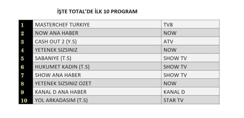 Total kategorisinde “MasterChef Türkiye”, zirvede yerini alırken, ikinci sırada “Now Ana Haber”, üçüncü sırada ise “Cash Out 2 (Yabancı Sinema)” kendine yer buldu.