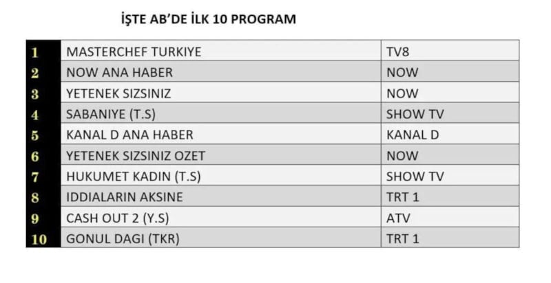 AB kategorisinde, “MasterChef Türkiye” birinci sırayı alırken, “Now Ana Haber” ikinci sırada, “Yetenek Sizsiniz” ise üçüncü sırada yer aldı