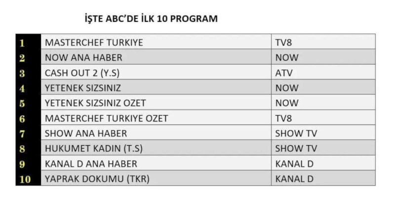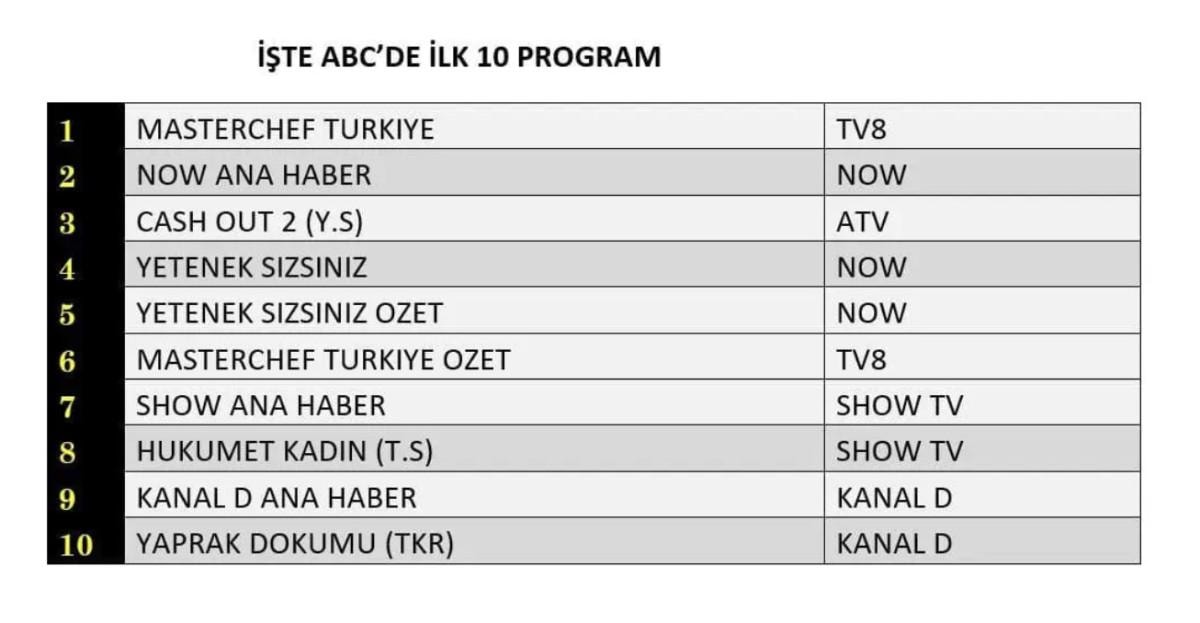 ABC grubunda da “MasterChef Türkiye” zirveyi kimseye bırakmadı. “Now Ana Haber” ikinci sırada yer alırken, “Cash Out 2 (Yabancı Sinema)” ise üçüncü sırada yer aldı.