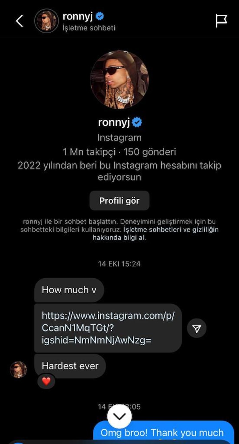 Kargo ücretini bile ben ödedim. Kargo ulaştı. Ronny J, tasarladığım ayakkabıları giyerek sosyal medyada paylaşım yaptı. Ben de mesaj atarak anlaştığımız rakam olan 800 doları göndermesini istedim ancak mesajlarıma cevap vermedi. Bu durumu video yaparak sosyal medyada paylaştım. O da yorum atarak onu karalamaya çalıştığımı söyledi. Yaklaşık 2 ay gibi bir süre oldu. Henüz ödeme alamadım. Sağlık olsun artık yapacak bir şey yok.”