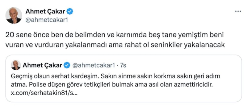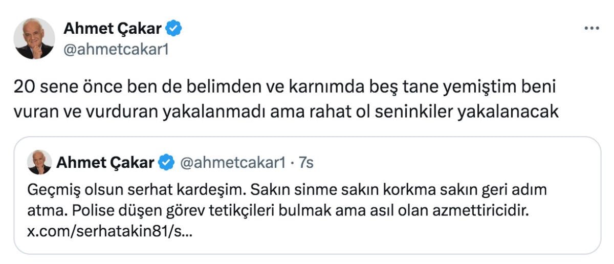 Serhat Akın'a yapılan silahlı saldırıya tepkiler çığ gibi büyürken bir paylaşımda Ahmet Çakar'dan geldi.