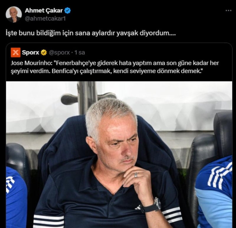 Jose Mourinho'nun "Fenerbahçe'ye giderek hata yaptım ama son güne kadar her şeyimi verdim. Benfica'yı çalıştırmak, kendi seviyeme dönmek demek." sözlerini alıntılayan Ahmet Çakar yaptığı paylaşımla dikkatleri üzerine çekti.