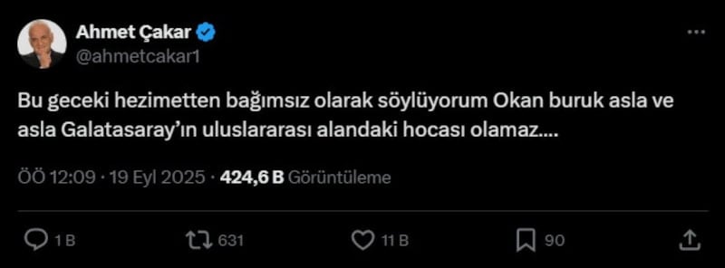 Galatasaray teknik direktörü Okan Buruk hakkında bir paylaşım yapan Ahmet Çakar dikkatleri üzerine çekti.