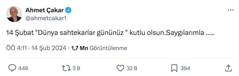 Sevgililer günü hakkında X(Twitter) hesabından bir paylaşım yapan Ahmet Çakar sosyal medyada gündem oldu.