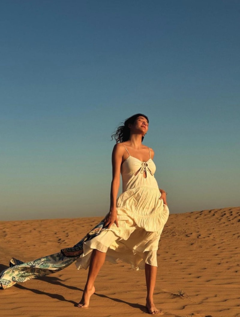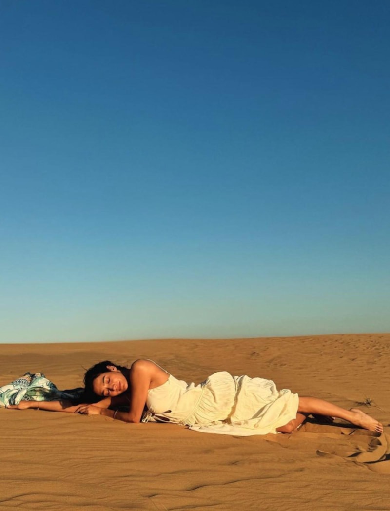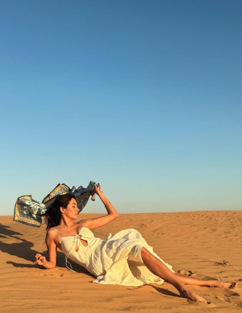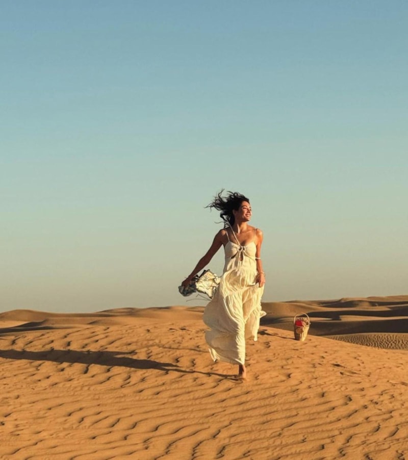 Tatil için Dubai'ye giden ünlü oyuncu Aybüke Pusat çölde çektiği pozlarını sosyal medya hesabından paylaştı.