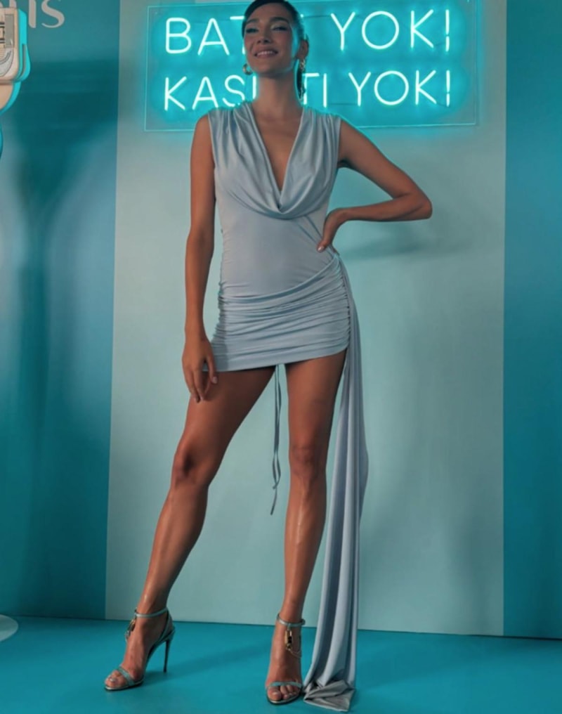 Mavi bir elbise tercih eden Aybüke Pusat'ın tarzı takipçileri tarafından beğenildi.