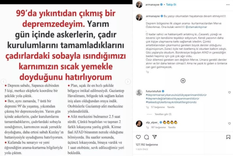 Yazısında 1999'daki depremde enkazdan çıkan bir depremzede olduğunu belirten Arman "Yarım gün içinde askerlerin, çadır kurulumlarını tamamladıklarını, çadırdaki sobayla ısındığımızı karnımızın sıcak yemekle doyduğunu hatırlıyorum" dedi.