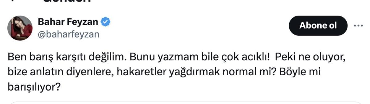 Önce, "Ben barış karşıtı değilim. Bunu yazmam bile çok acıklı. Peki ne oluyor, bize anlatın diyenlere, hakaretler yağdırmak normal mi? Böyle mi barışılıyor?" ifadelerini kullanan Bahar Feyzan, ardından Ensonhaber'in X paylaşımını alıntılayarak şunları yazdı: