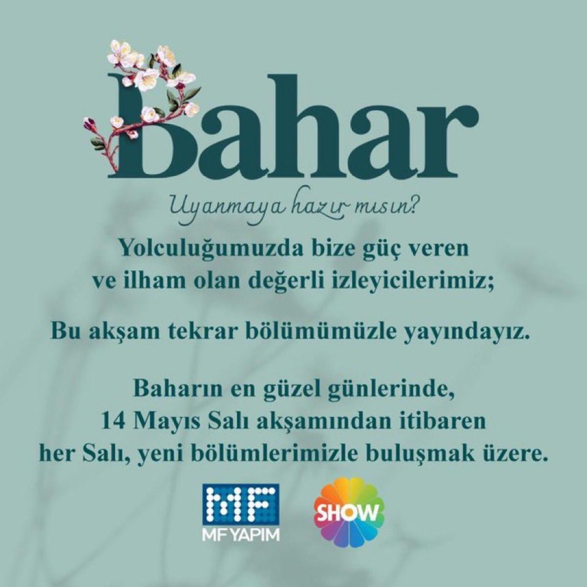 Bahar dizisi resmi hesabından yapılan açıklama ile, yeni bölümün yayınlanmayacağı duyuruldu. Bu sebeple 7 Mayıs Salı akşamı tekrar bölümü yayınlanacak.