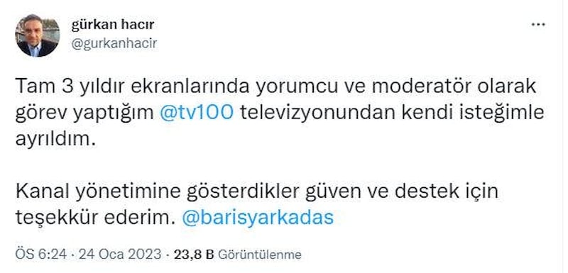 "Tam 3 yıldır ekranlarında yorumcu ve moderatör olarak görev yaptığım tv100 televizyonundan kendi isteğimle ayrıldım. Kanal yönetimine gösterdikleri güven ve destek için teşekkür ederim"