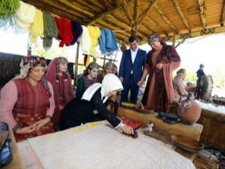 Davutoğlu, Süleyman Şah çadırından çıktıktan sonra dizi filmde Deli Demir karakterini canlandıran Mehmet Çevik’in yanına giderek önce sohbet etti, ardından gömleğinin kollarını sıvazlayıp dizi film oyuncularıyla birlikte demir dövdü.