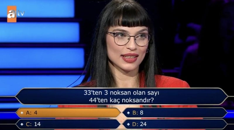 Yöneltilen, "33'ten 3 noksan olan sayı 44'ten kaç noksandır?" şeklindeki sorunun cevabı, 14 olarak bulunuyordu.
