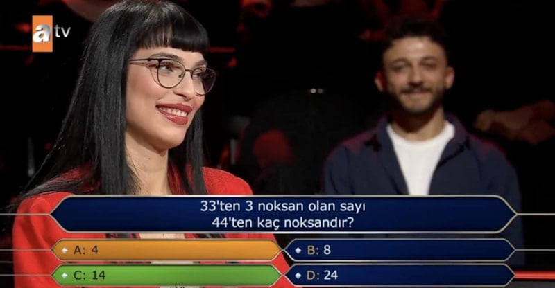 Ancak yarışmacı, soruyu yanıtlamakta zorlandı ve sonunda 4 seçeneğini işaretleyerek yanlış cevabı verdi ve yarışmadan elendi.
