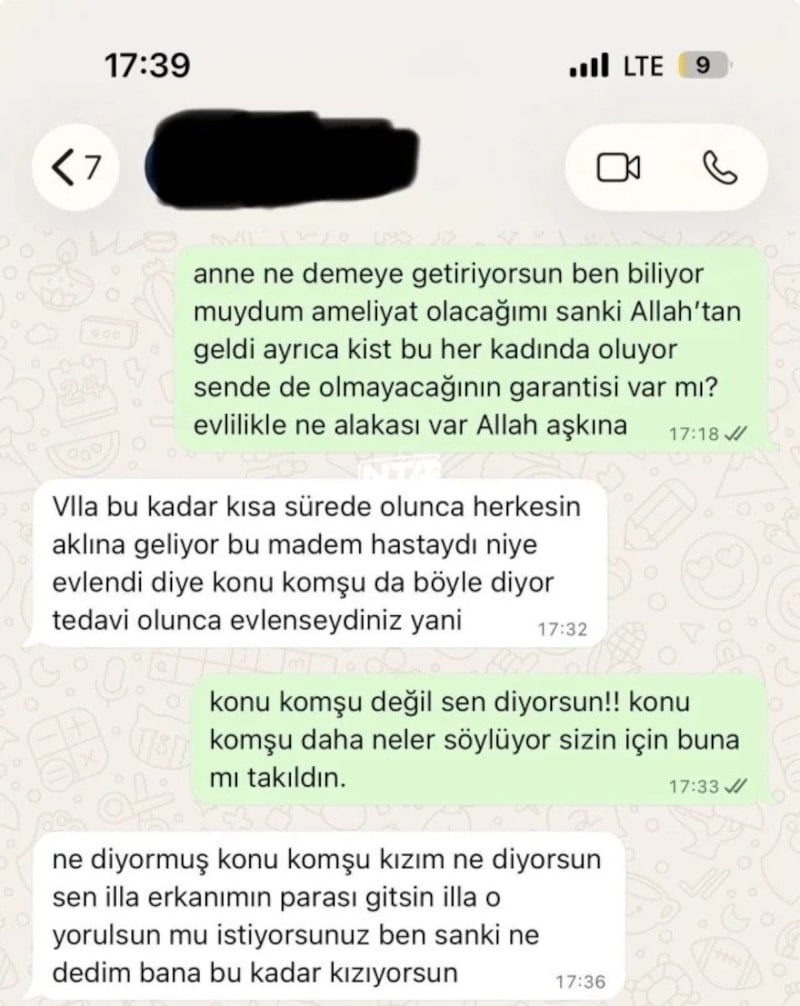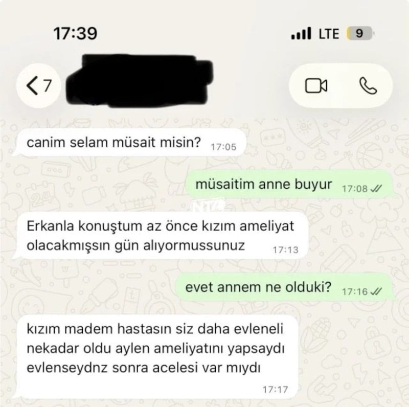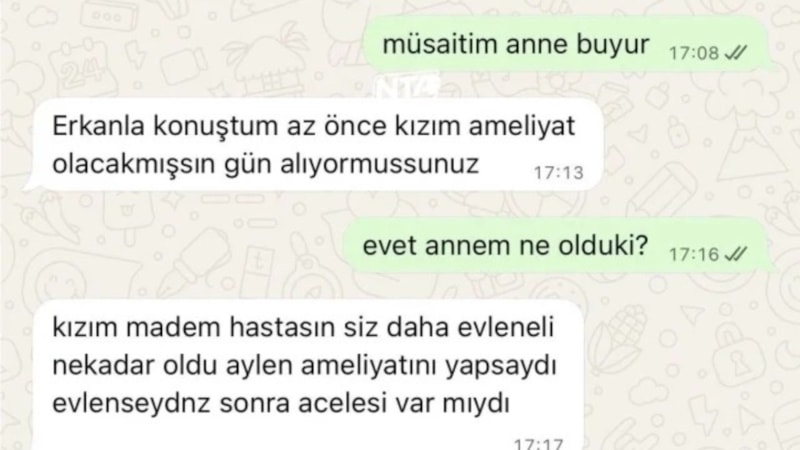 Yazışmalarda kaynananın, gelinin ameliyat süreci üzerinden evliliği sorguladığı görüldü. “Madem hastasın, ailen ameliyatını yapsaydı, evlendikten sonra acelesi var mıydı” sözleri dikkat çekerken, “Konu komşu da böyle diyor, madem hastaydı niye evlendi” ifadeleri ise tartışmayı farklı bir boyuta taşıdı.