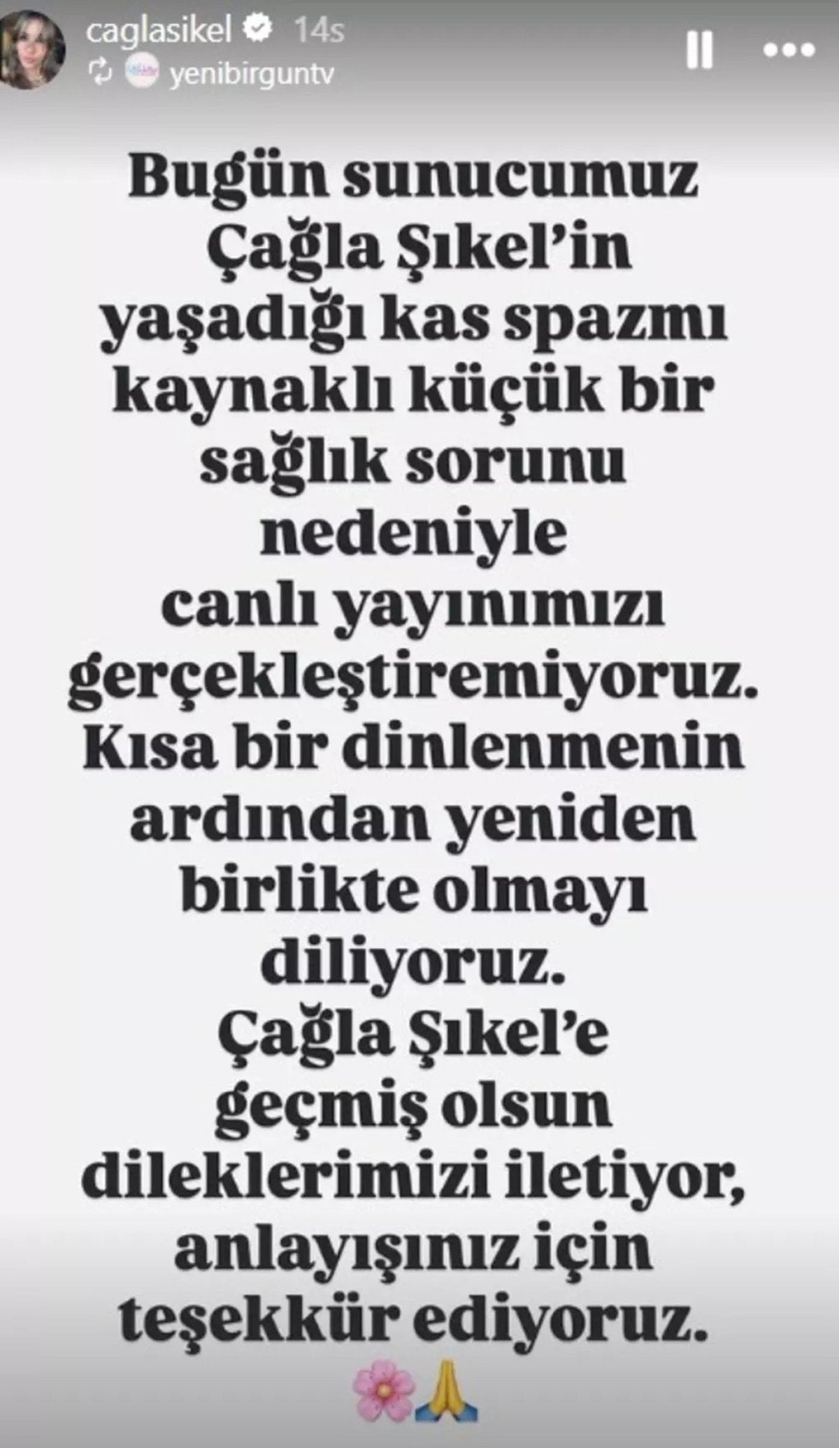 Yapılan açıklamada; "Bugün sunucumuz Çağla Şıkel'in yaşadığı kas spazmı kaynaklı küçük bir sağlık sorunu nedeniyle canlı yayınımızı gerçekleştiremiyoruz. Kısa bir dinlenmenin ardından yeniden birlikte olmayı diliyoruz. Çağla Şıkel'e geçmiş olsun dileklerimizi iletiyor, anlayışınız için teşekkür ediyoruz." ifadelerine yer verildi.