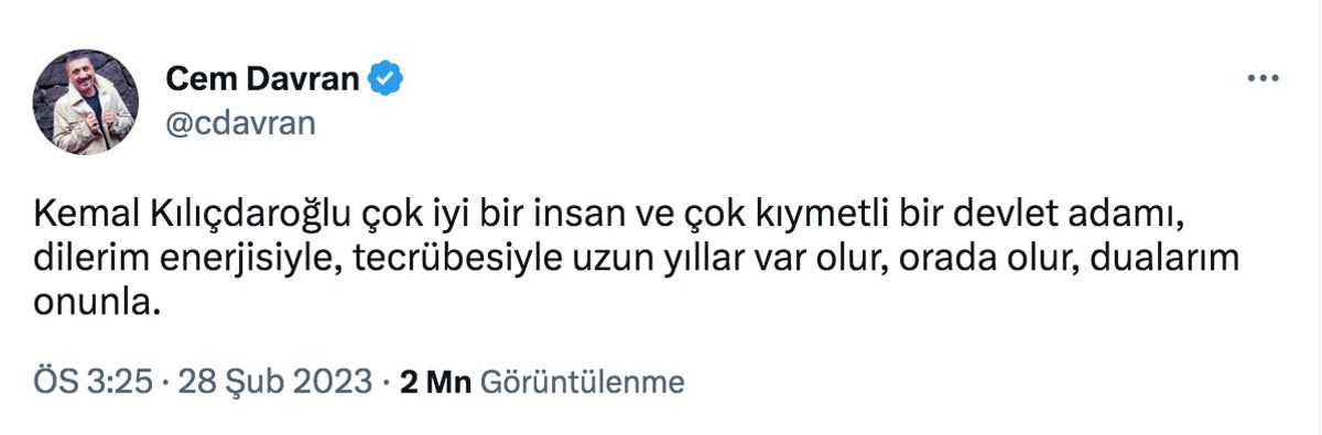 Cem Davran Twitter hesabından yaptığı paylaşımda "Kemal Kılıçdaroğlu çok iyi bir insan ve çok kıymetli bir devlet adamı, dilerim enerjisiyle, tecrübesiyle uzun yıllar var olur, orada olur, dualarım onunla." ifadelerine yer verdi.