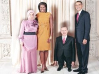 Dün akşam saatlerinde hastaneden taburcu edilen Erdoğan, yeni haliyle kendini tanıtmak için turlara başladı ve ilk durak olarak Beyaz Saray'a gelerek kendisini Obama ailesine gösterdi. Fotoğrafta, Erdoğan'ın yeni ve sempatik haline hayranlıklarını gizleyemeyen Obama'lar ve minik eşine tam da alışamamış, buruk ve hüzünlü Emine hanım görülüyor.