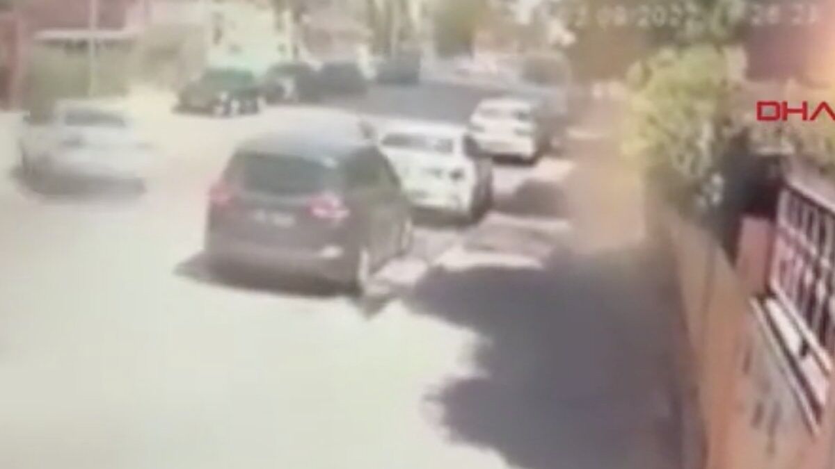 Sürücüsünün kontrolünden çıkan otomobil, sokakta yürüyen kadın ile çocuğun yanından savrularak geçti. Sürücü daha sonrasında evin bahçesine girdi.