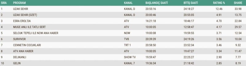 Her hafta pazartesi günü reytinglere damga vuran Uzak Şehir dizisi, y,ne birinci sırada yer aldı.