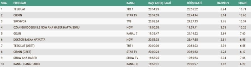 İkinci sırada Star TV'nin yeni dizisi Çirkin, üçüncü sırada ise Survivor yarışma programı yer aldı.