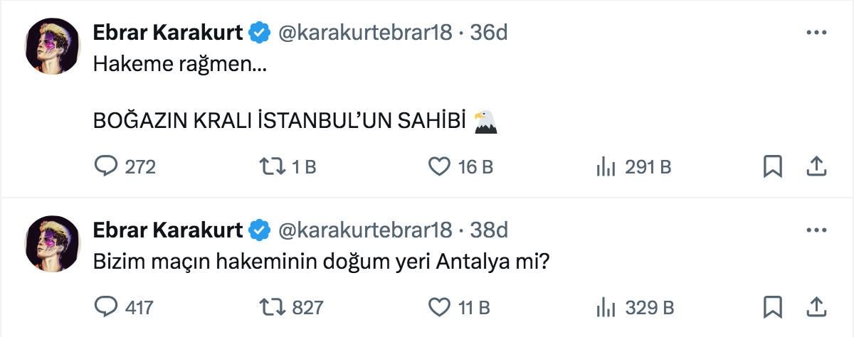X hesabından paylaşım yapan Karakurt "Bizim maçın hakeminin doğum yeri Antalya mı?" ve "Hakeme rağmen… Boğazın Kralı İstanbul'un Sahibi" ifadelerine yer verdi.