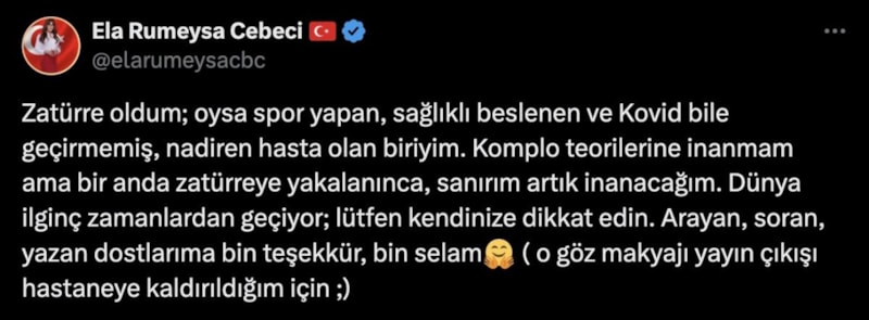 Takipçilerini hastalığa karşı uyaran Cebeci, geçmiş olsun dilekleri için arayanlara teşekkür etmeyi de unutmadı.