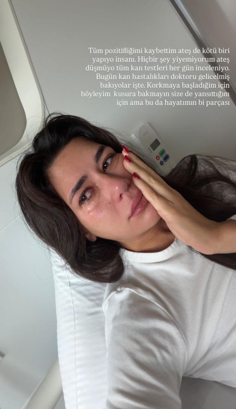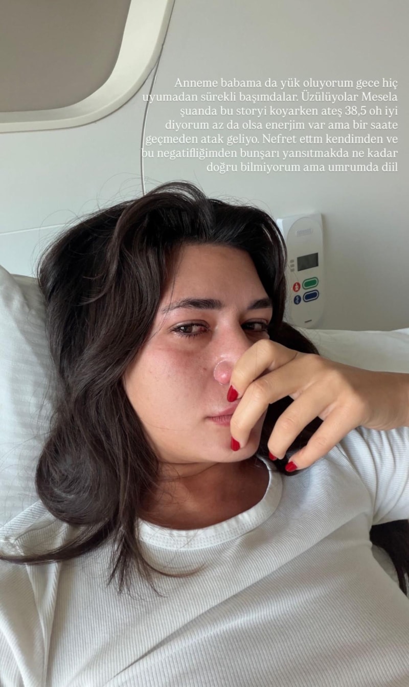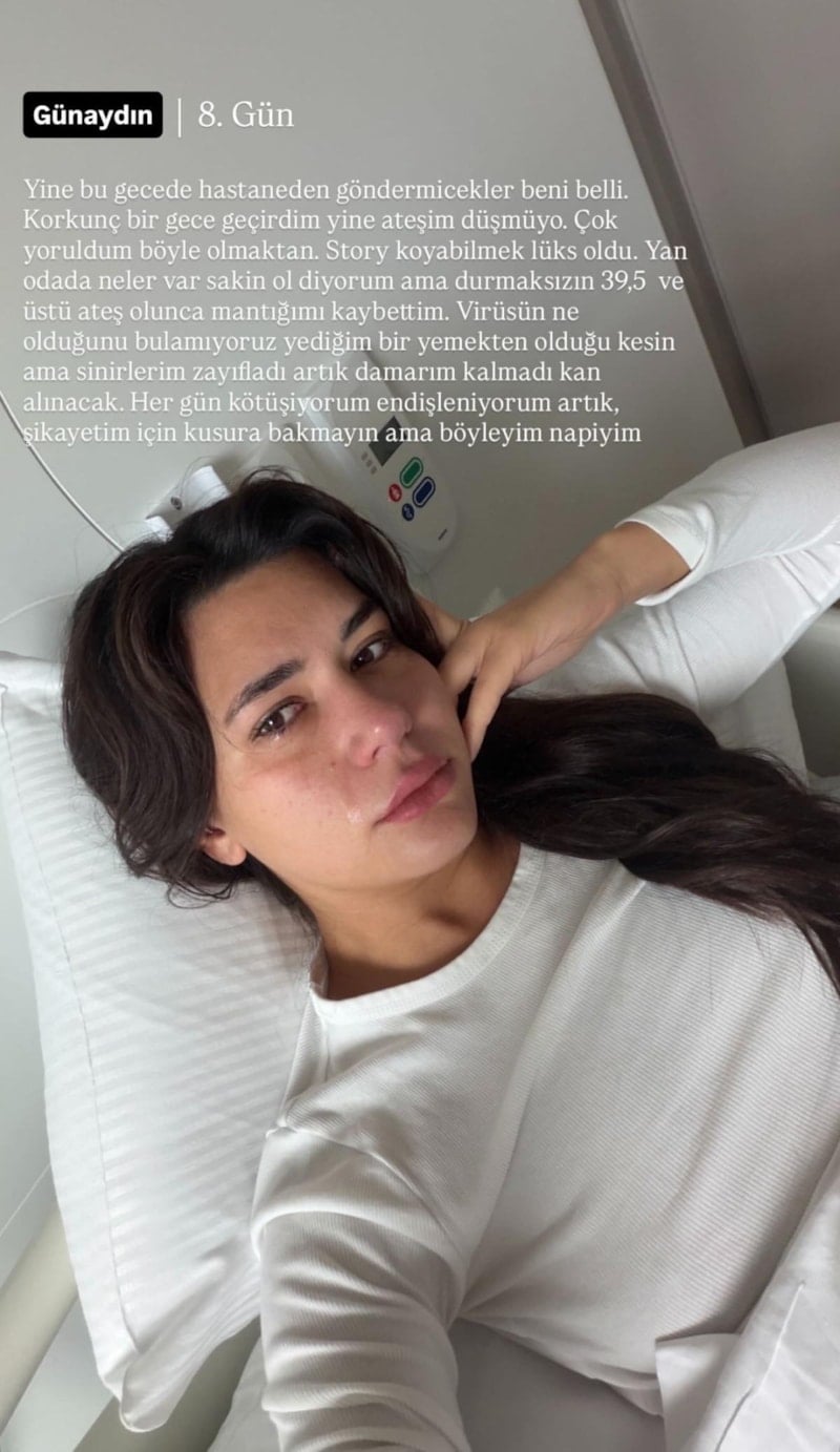 "Yine bu gecede hastaneden göndermeyecekler beni belli. Korkunç bir gece geçirdim yine, ateşim düşmüyor. Çok yoruldum böyle olmaktan. Story koyabilmek lüks oldu. Yan odada neler var sakin ol diyorum ama durmaksızın 39,5 ve üstü ateş olunca mantığımı kaybettim. Virüsün ne olduğunu bulamıyoruz, yediğim bir yemekten olduğu kesin ama sinirlerim zayıfladı, artık damarım kalmadı kan alınacak. Her gün kötüleşiyorum, endişeleniyorum artık, şikayetim için kusura bakmayın ama böyleyim, napıyım."