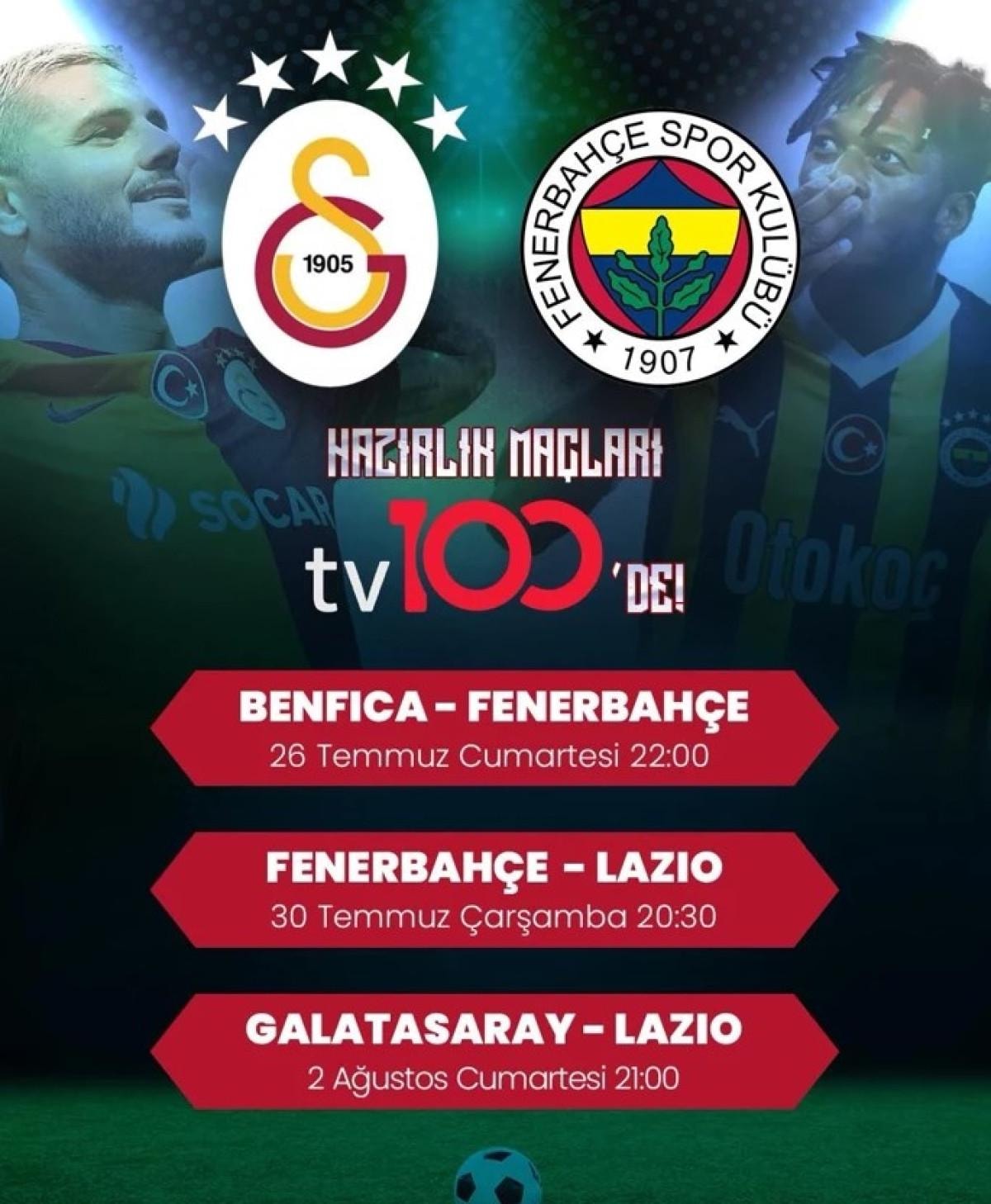Yeni sezon kapıya dayandı! Fenerbahçe ve Galatasaray’ın hazırlık maçları, tv100 ekranlarında futbolseverlerle buluşuyor. Tarihler not edin: 26 Temmuz Cumartesi, 30 Temmuz Çarşamba ve 2 Ağustos Cumartesi akşamları nefesler tutulacak!