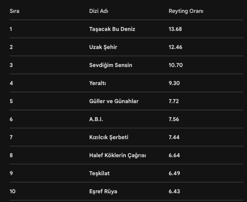 Total'de ikinci sırada Uzak Şehir dizisi, üçüncü sırada ise Sevdiğim Sensin dizisi yer aldı.