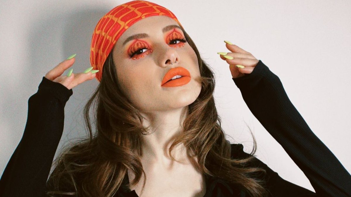 Son olarak turuncu göz ve dudak makyajı ile kamera karşısına geçen fenomen, siyah derin dekoltesiyle poz verdi.