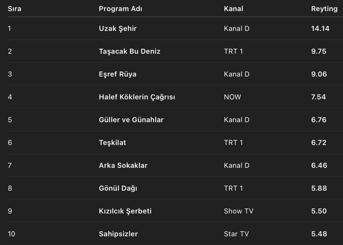 Reyting sıralamasında bu hafta da zirve değişmedi. Uzak Şehir, haftanın en çok izlenen yapımı oldu.
