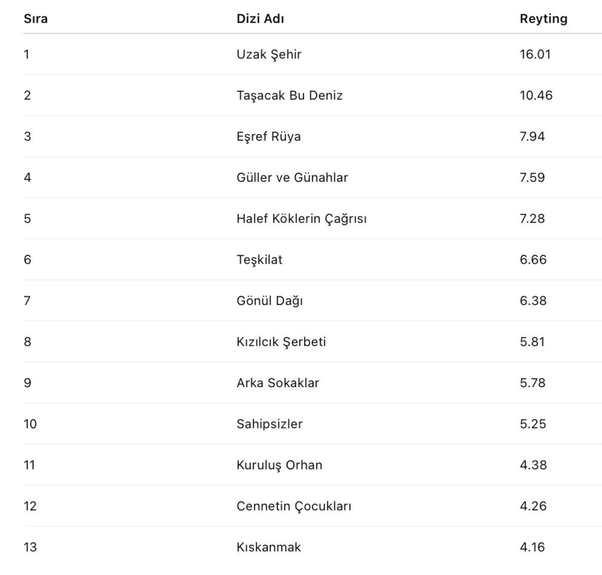 TRT 1'in yeni dizisi Taşacak Bu Deniz ise ikinci sırayı kaptı. Üçüncü sırada Eşref Rüya yer aldı.