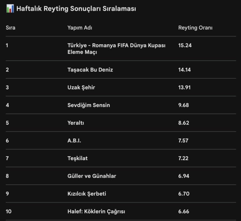 Geçtiğimiz hafta Türkiye - Romanya maçı reytinglere damga vurdu. Listede ilk sıraya yerleşti.