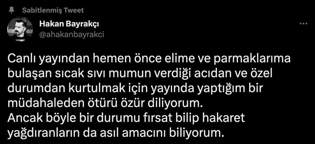 Canlı yayından hemen önce elime ve parmaklarıma bulaşan sıcak sıvı mumun verdiği acıdan ve özel durumdan kurtulmak için yayında yaptığım bir müdahaleden ötürü özür diliyorum. Ancak böyle bir durumu fırsat bilip hakaret yağdıranların da asıl amacını biliyorum.