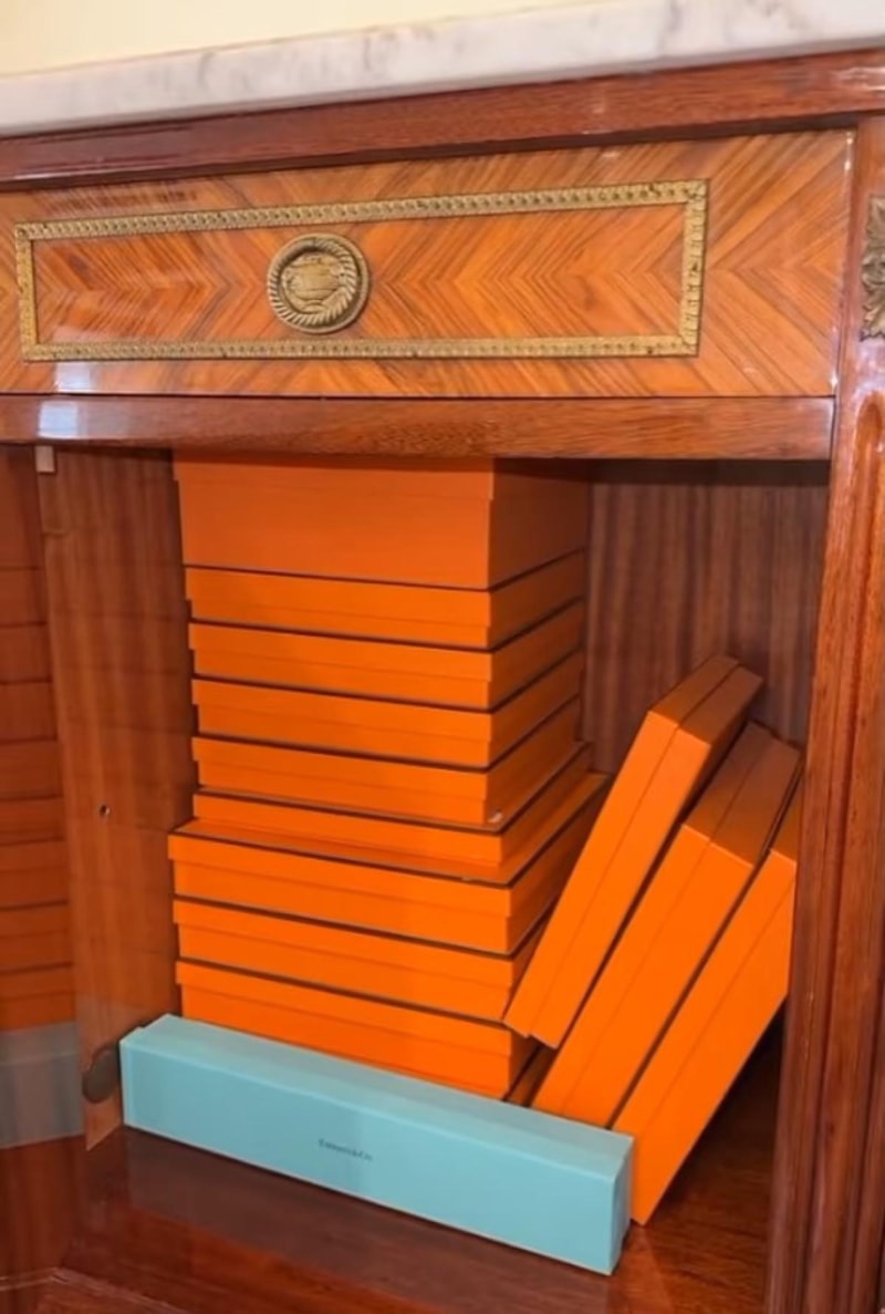Dolabın içinin Hermes marka turuncu kutular ve Tiffany&Co mavi kutularıyla dolu olduğunu fark etti.