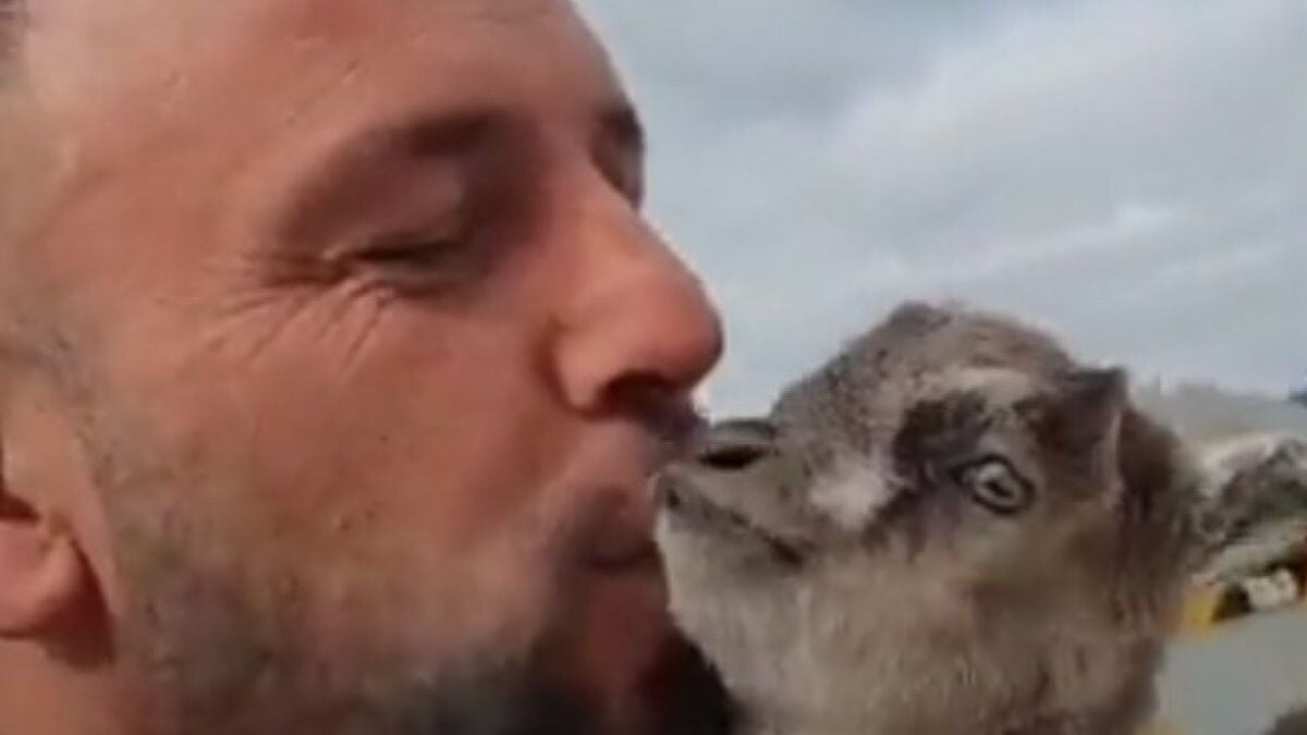Sevimliliği ile dikkat çeken keçi, kucakta huzursuzlanırken, adam da hayvanı öpücüklere boğdu.
