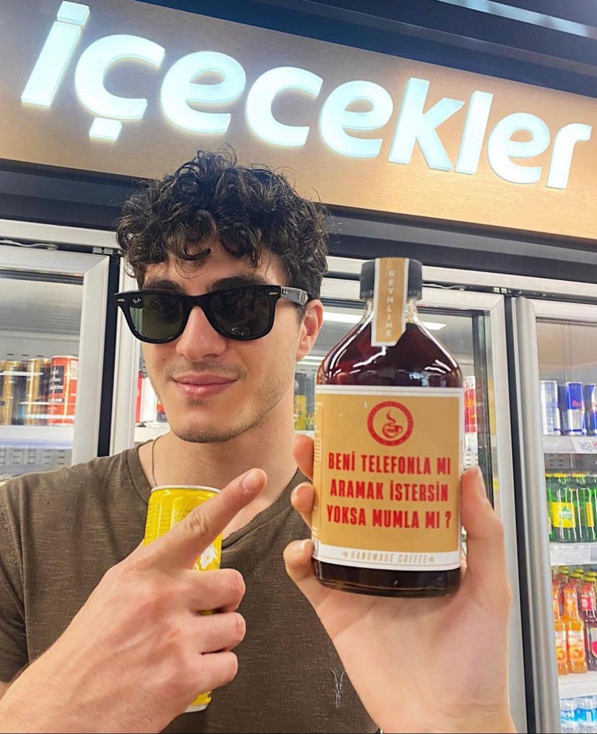 Rol arkadaşı Enes Koçak'ın elinde "Beni telefonla mı aramak istersin yoksa mumla mı?" yazılı şişesiyle verdiği pozunu takipçileriyle paylaştı.