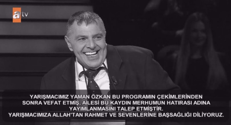 Kim Milyoner Olmak İster'in 22 Haziran Pazar günü yayınlanan bölümünde yarışan diş hekimi Yaman Özkan, program çekimlerinden kısa bir süre sonra yaşamını yitirdi. Bilgisi ve sakin tavırlarıyla dikkat çeken Özkan'ın son anları televizyon ekranından verildi.
