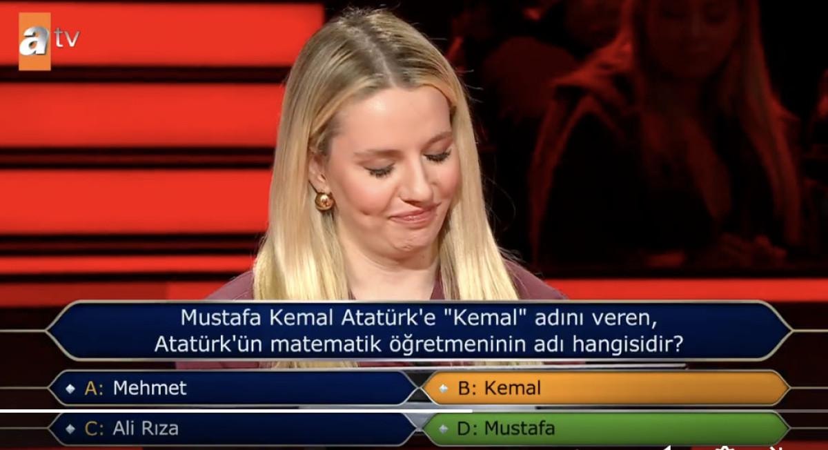 "Kim Milyoner Olmak İster" yarışmasında bir yarışmacı, "Mustafa Kemal Atatürk'e 'Kemal' adını veren matematik öğretmeninin adı hangisidir?" sorusuna “Kemal” yanıtını verdi.