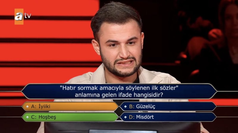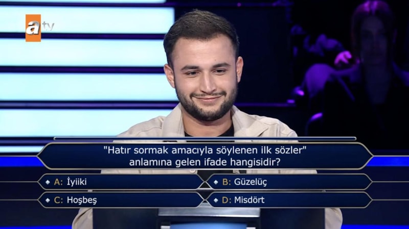 Yarışmacını karşısına ikinci soruda, "Hatır sormak amacıyla söylenen ilk sözler anlamına gelen ifade hangisidir?" sorusu çıktı.