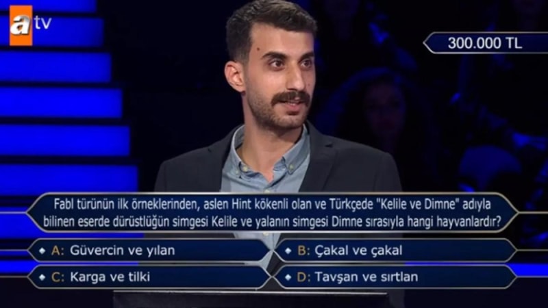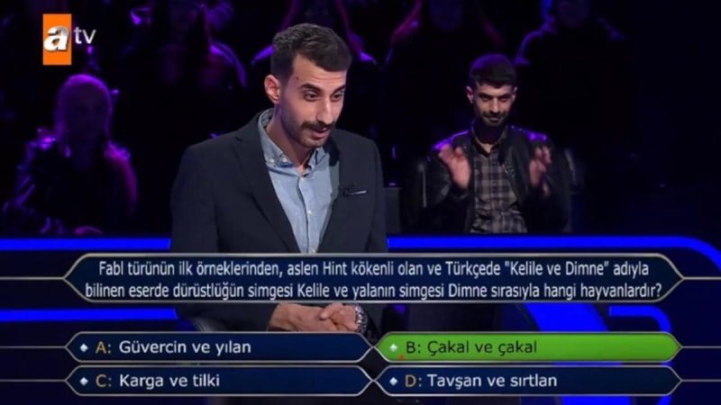 Yarışmacıya, 'Fabl türünün ilk örneklerinden, aslen Hint kökenli olan ve Türkçede 'Kelile ve Dimne' adıyla bilinen eserde dürüstlüğün simgesi Kelile ve yalanın simgesi Dimne sırasıyla hangi hayvanlardır?' sorusu soruldu.