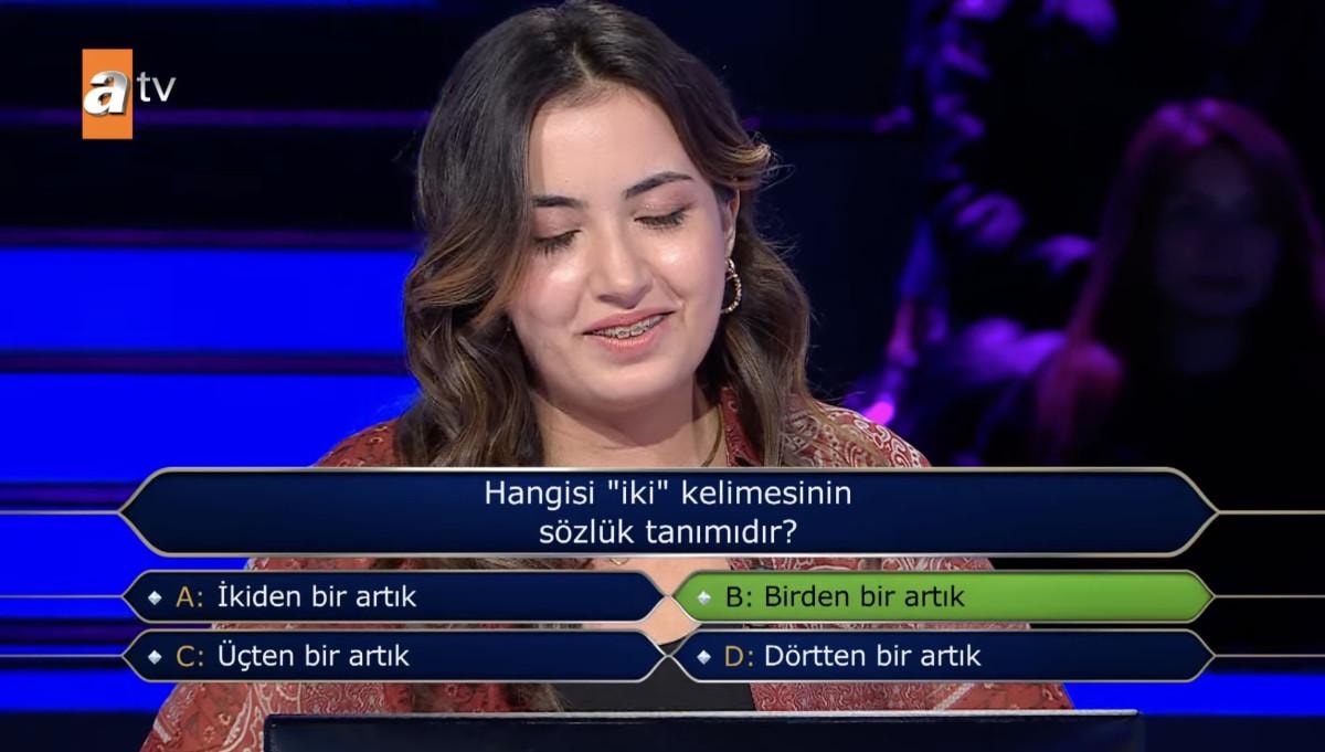 Türkiye genelinde eşit ağırlıkta 75. olan Galatasaray Üniversitesi Hukuk Fakültesi hazırlık bölümü öğrencisi Ayşe Naz Babalık'a,"Hangisi 'iki' kelimesinin sözlük tanımıdır?" sorusu soruldu.