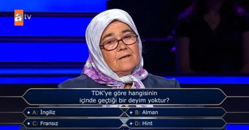 1 Milyon TL değerindeki o soru ise "TDK'ye göre hangisinin içinde geçtiği bir deyim yoktur?" oldu.