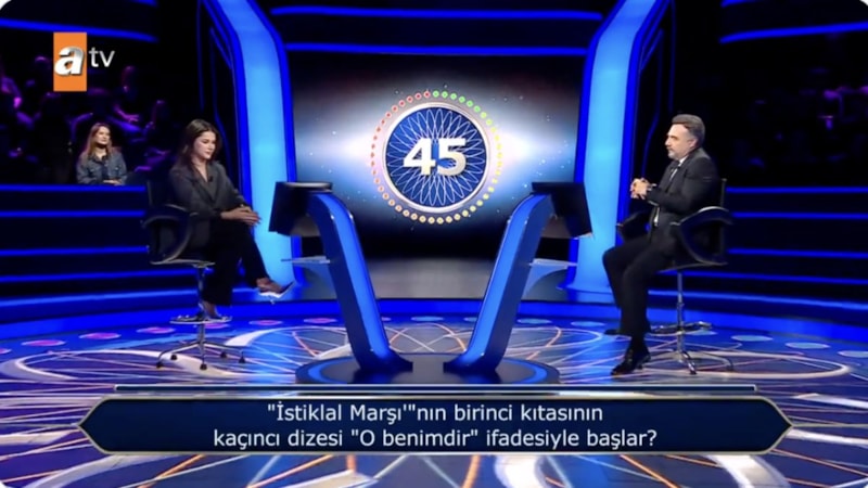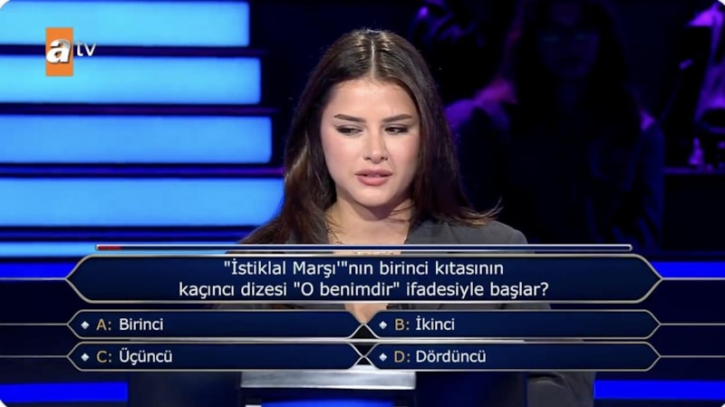 Kadın bir yarışmacıya, "İstiklal Marşı'nın birinci kıtasının kaçıncı dizesi 'O benimdir' ifadesiyle başlar?" sorusu soruldu.
