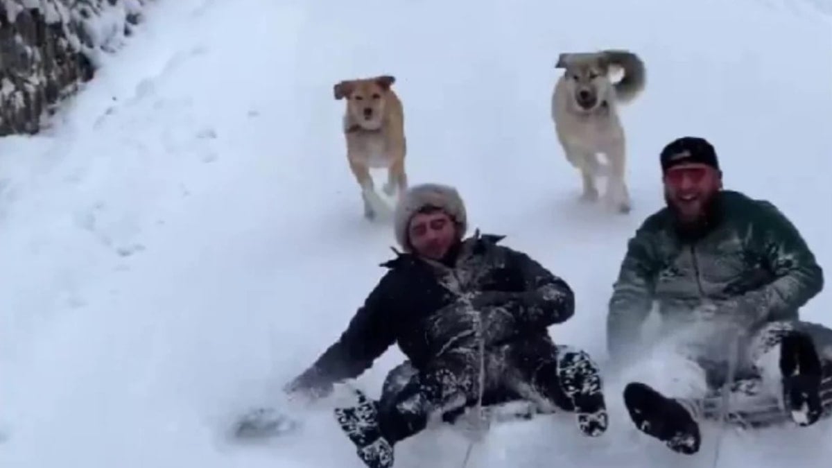 Kızak keyfine sokak köpekleri de dahil oldu.