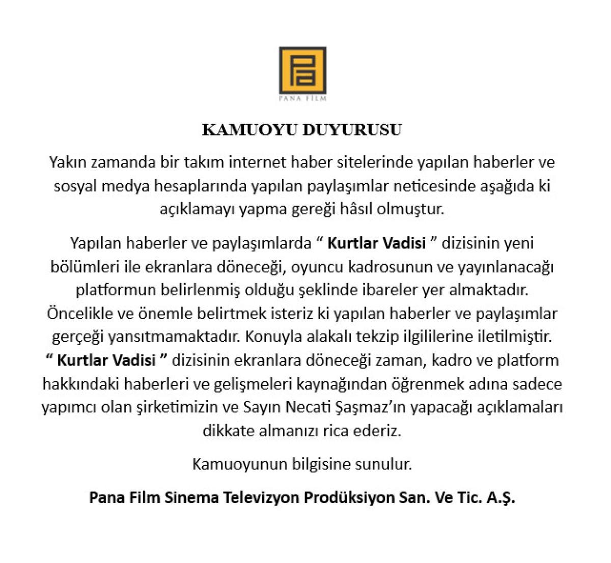 Pana Film tarafından yapılan açıklamada, Kurtlar Vadisi'nin yeniden başlayacağı ile ilgili iddiaların gerçeği yansıtmadığı belirtildi.