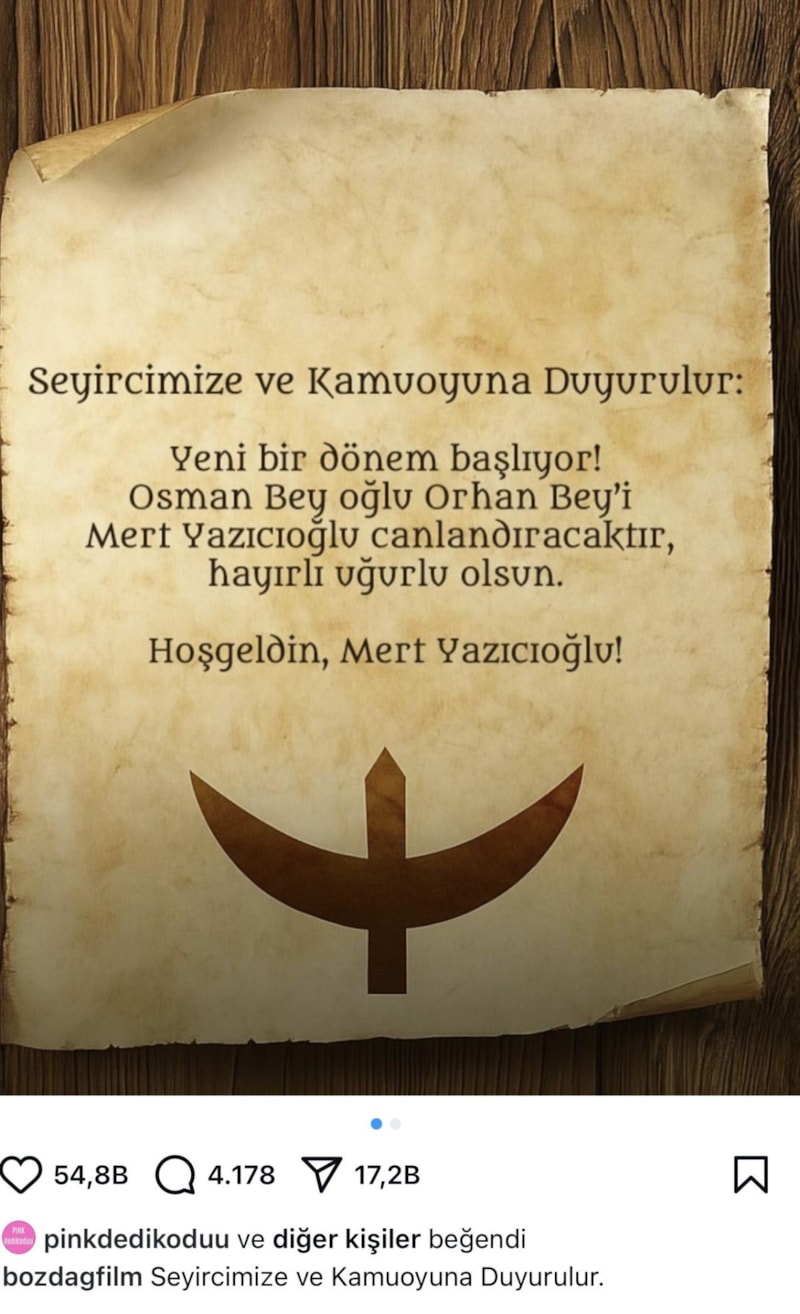 "Yeni dönem başlıyor! 'Osman Bey'in oğlu 'Orhan Bey'i Mert Yazıcıoğlu canlandıracaktır, hayırlı uğurlu olsun. Hoş geldin, Mert Yazıcıoğlu!"