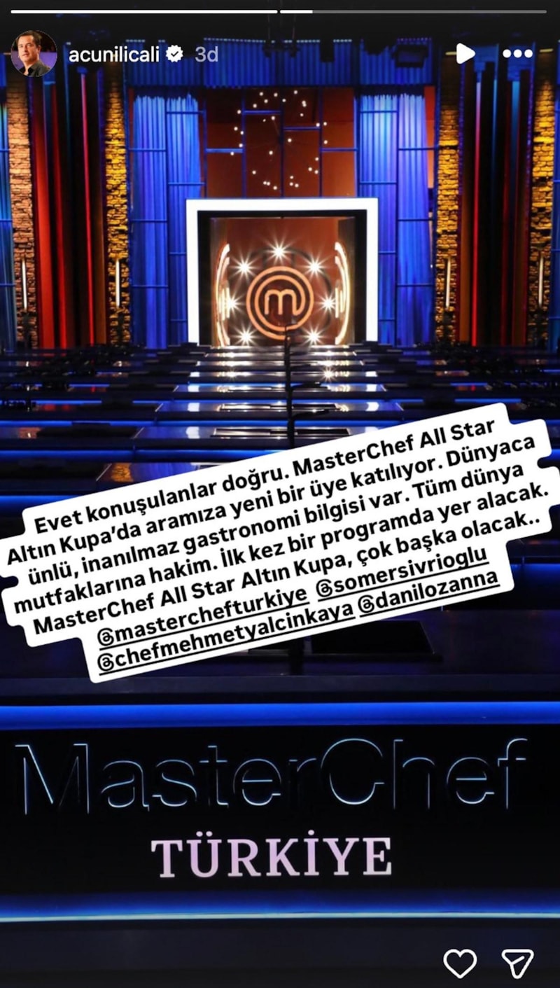 Acun Ilıcalı paylaşımında “Evet konuşulanlar doğru. MasterChef All Star Altın Kupa’da aramıza yeni bir üye katılıyor. Dünyaca ünlü, inanılmaz gastronomi bilgisi var. Tüm dünya mutfaklarına hakim. İlk kez bir programda yer alacak. MasterChef All Star Altın Kupa, çok başka olacak...' ifadelerini kullandı.